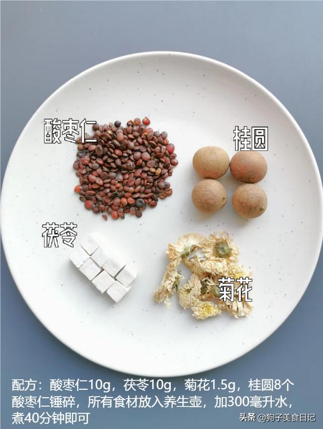 茯苓宁快慰神,酸枣仁养心补肝、安神助眠。