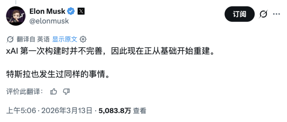 并吞天,他在X平台发了条公开认错的推文:「xAI第一次没搭对,正在从地基驱动重建。」