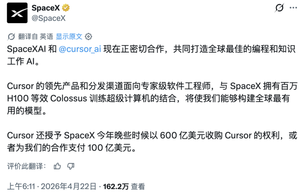 就在刚刚,SpaceX在X平台发帖晓谕,已与Cursor杀青讨好,并取得了一项收购礼聘权:本年晚些时候不错600亿好意思元将Cursor举座收入囊中,也不错支付100亿好意思元,手脚两边讨好阶段的价钱。